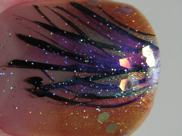 I first painted about half of my nail with China Glaze In Awe Of Amber. I then added So Easy Stripe Rite in Black for the feathers. I painted over the black with China Glaze Sexy In The City and Coconut Kiss for the purple and blue iridescent look of feathers. I also added OPI Goldilocks Rocks towards the edge to make a more gradient gold look. I painted over everything with China Glaze Golden Enchantment for the light sparkle. I added sparse glitter to the end and then topped it all with a coat of Seche Vite.